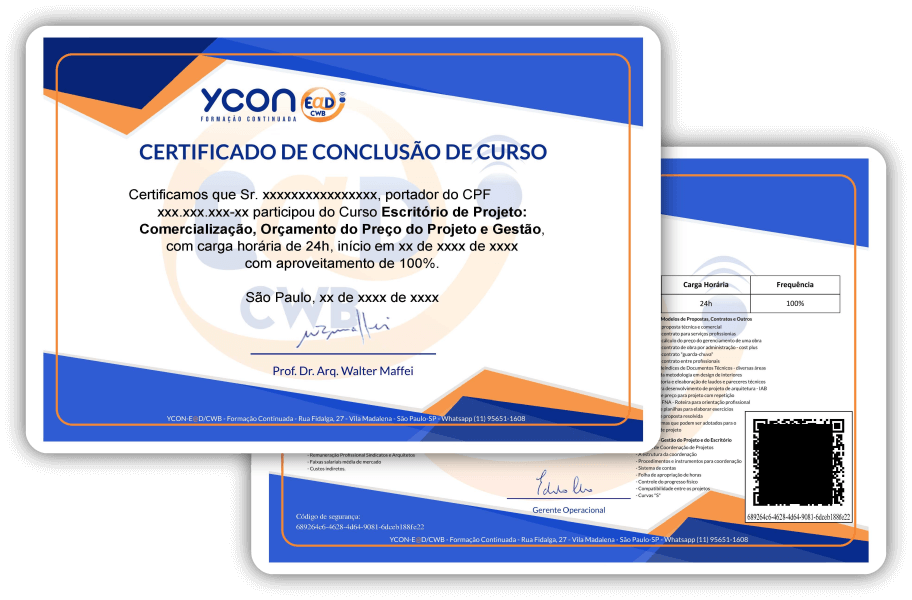 Receba o certificado da YconEaDCWB (com peso de +30 anos da Ycon formação continuada), reconhecido nacionalmente.